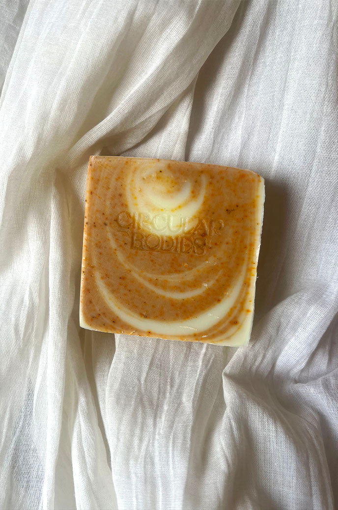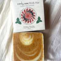 Our Candy Cane Body Bar was created to celebrate a holiday classic, with a fresh peppermint scent. Made with turmeric and annato seed for a bright orange and white swirl. This body bar is a 4-in-1 shampoo (no conditioned needed!), face wash, body soap and shave bar. This bar is 100% biodegradable and it is gentle on sensitive skin and on our earth's water and soils.